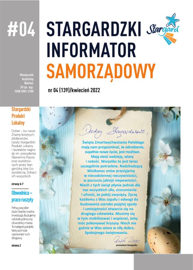 Wielkanocne życzenia od prezydenta Rafała Zająca, relacja ze Stargardzkiej Gali Przedsiębiorczości i Niebieskiego Marszu oraz zaproszenia na wyjątkowe koncerty – to wszystko i znacznie więcej można znaleźć w najnowszym numerze „Stargardzkiego Informatora Samorządowego”. Oprócz tego zaglądamy na budowę fragmentu obwodnicy północnej. W kwietniowym SISie są też ważne informacje dla posiadaczy Stargardzkiej Karty Mieszkańca.