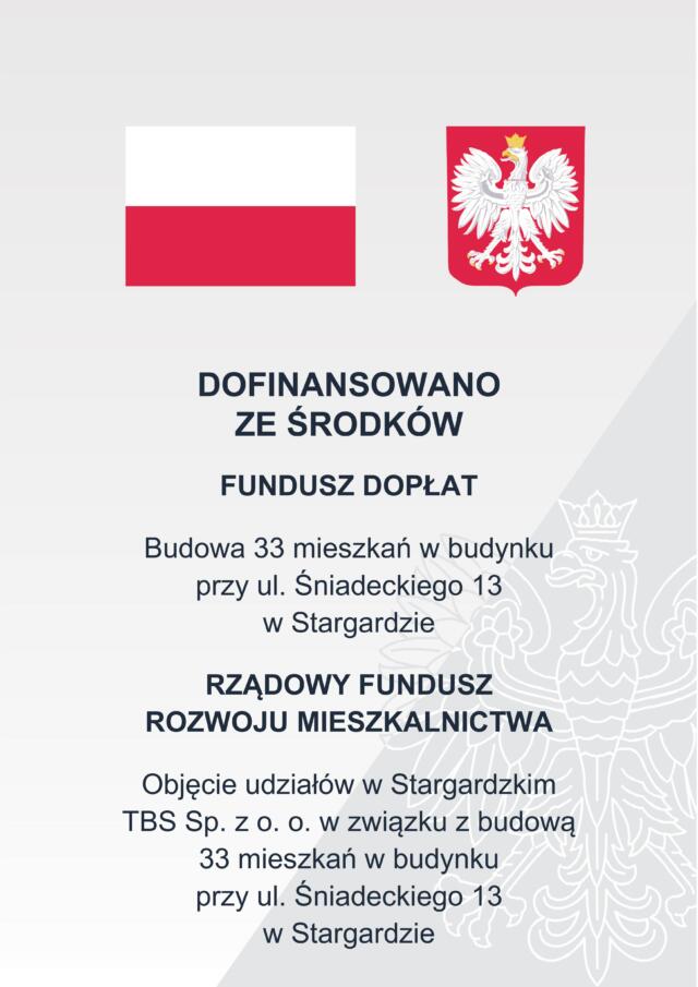 Projekt pn. „Budowa 33 mieszkań w budynku przy ul. Śniadeckiego 13 w Stargardzie” jest dofinansowany przez Bank Gospodarstwa Krajowego z Funduszu Dopłat w ramach finansowego wsparcia na pokrycie części kosztów przedsięwzięcia polegającego na utworzeniu 33 lokali mieszkalnych na wynajem z prawem do podnajmowania oraz Rządowego Funduszu Rozwoju Mieszkalnictwa.