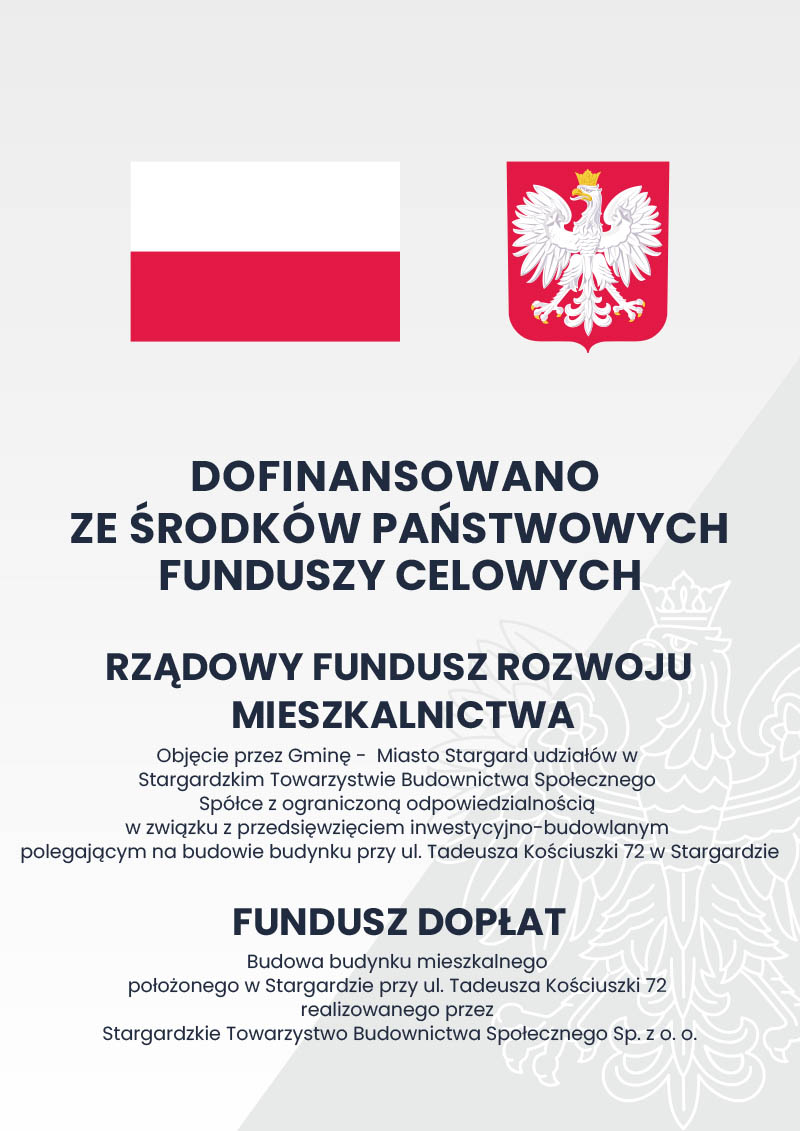 Projekt pn. „Budowa budynku mieszkalnego położonego w Stargardzie przy ul. Tadeusza Kościuszki 72 realizowanego przez Stargardzkie Towarzystwo Budownictwa Społecznego Sp. z o. o.” jest dofinansowany z Funduszu Dopłat w ramach finansowego wsparcia na pokrycie części kosztów przedsięwzięcia polegającego na finansowym udziale Miasta w budowie budynku z 14 mieszkaniami przeznaczonymi na wynajem.