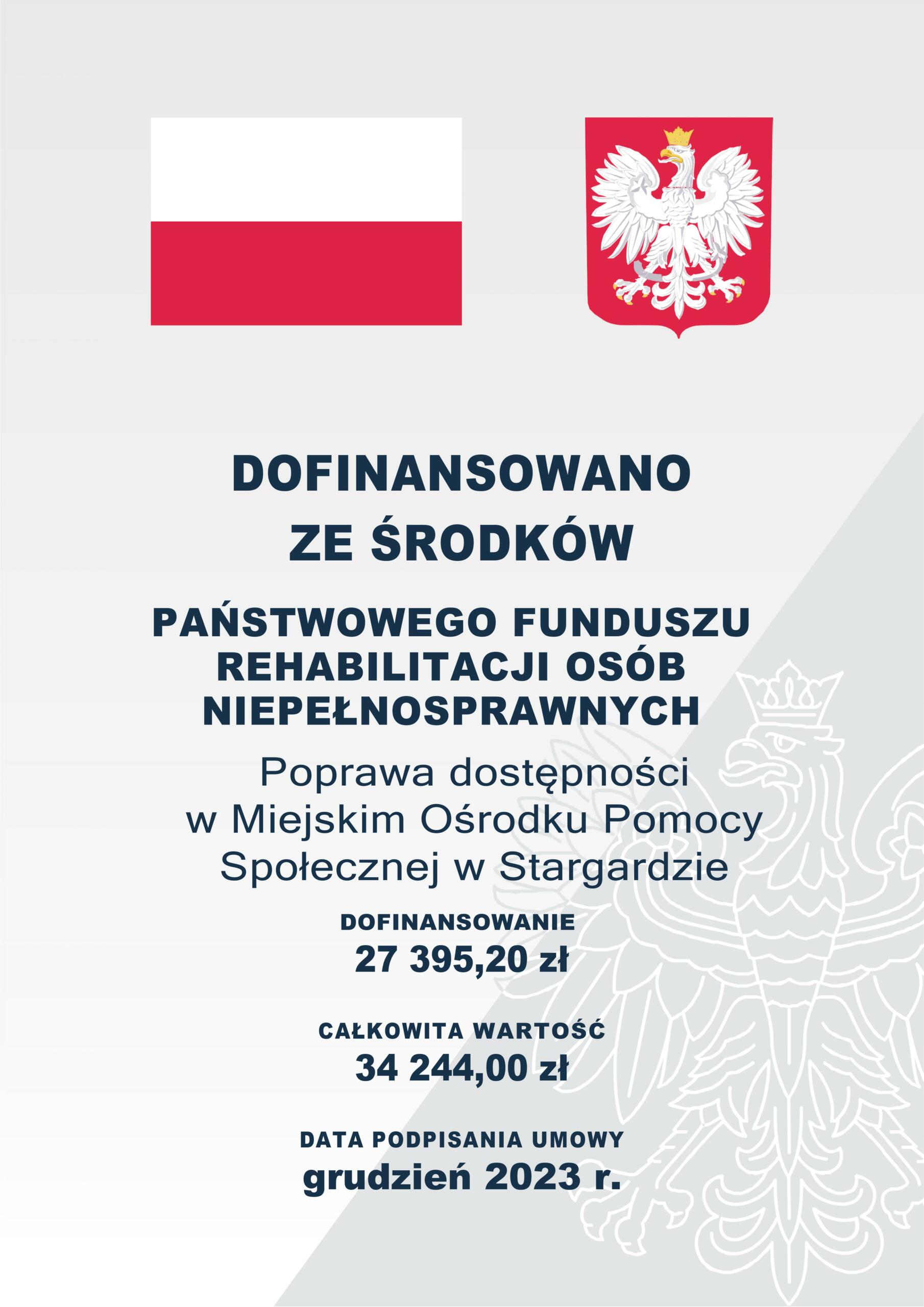 Projekt pn. „Poprawa dostępności w Miejskim Ośrodku Pomocy Społecznej w Stargardzie” jest dofinansowany z Państwowego Funduszu Rehabilitacji Osób Niepełnosprawnych w ramach programu „Dostępna przestrzeń publiczna” moduł A – likwidacja barier architektonicznych lub informacyjno-komunikacyjnych przez jednostki samorządu terytorialnego lub ich jednostki organizacyjne.