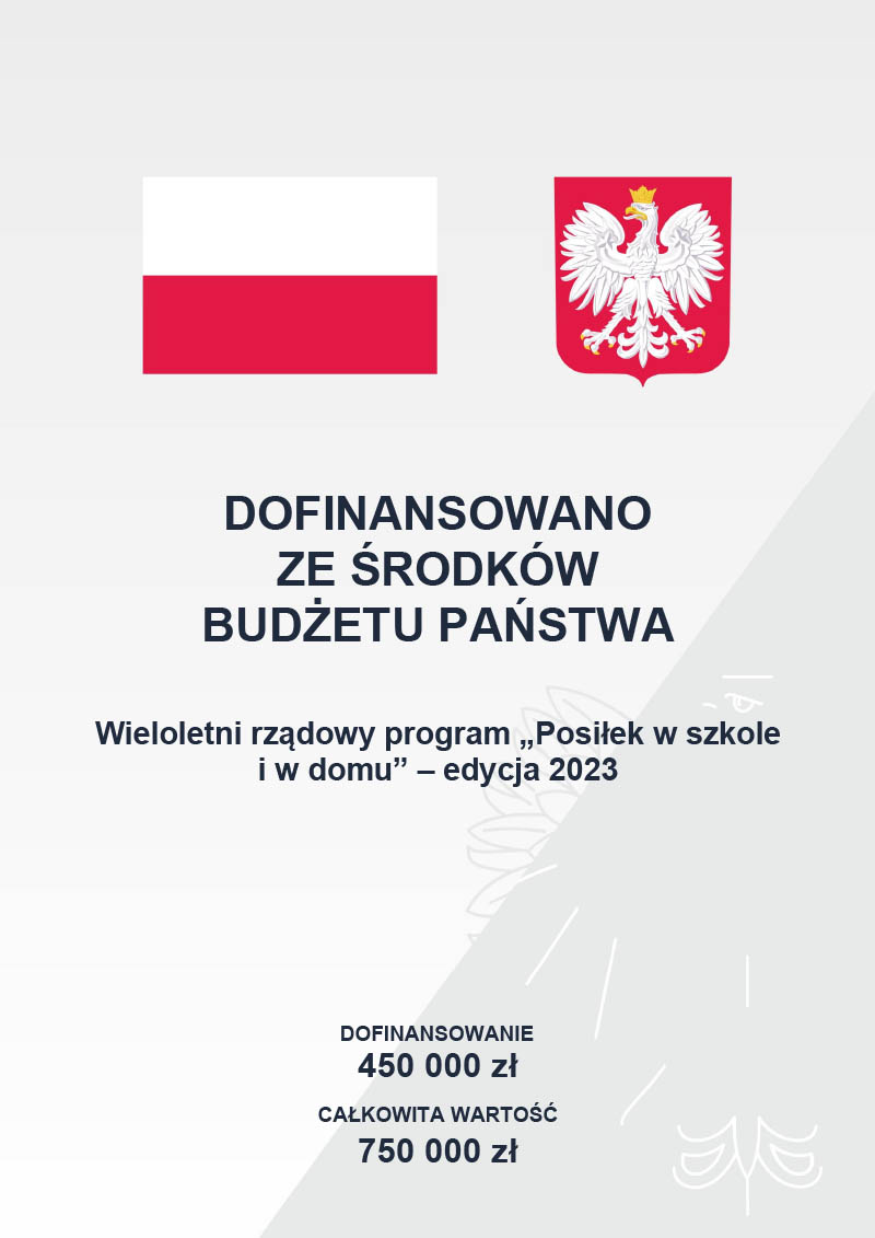 Projekt pn. „Posiłek w szkole i w domu” edycja 2024 jest dofinansowany ze środków budżetu państwa w ramach Wieloletniego rządowego programu „Posiłek w szkole i w domu” na lata 2024-2028 moduł 1 i 2.